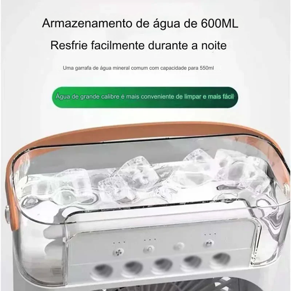 Com funções de ventilador, ar-condicionado e umidificador, este aparelho inovador é tudo o que você precisa para enfrentar os dias quentes de verão e a secura do inverno. Basta adicionar água e gelo, e pronto! Sinta a brisa refrescante instantaneamente.